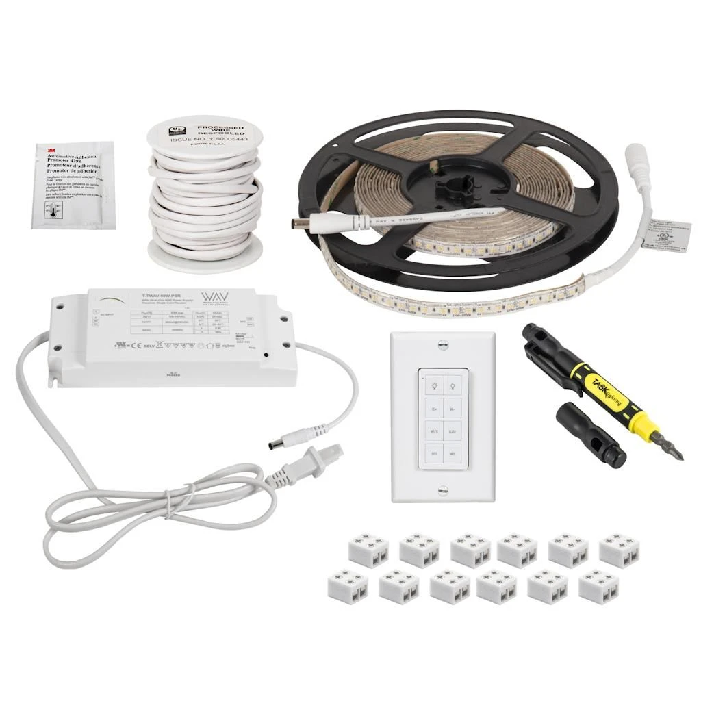 | All included: | Contains 16 ft roll of TandemLED series tape, two 6-packs of 8 mm EZ Connectors, WAV All-In-One 60W Smart Receiver/Power Supply, 25 ft connection wire, one-zone TandemLED wireless controller, screwdriver, adhesive promoter wipe. |